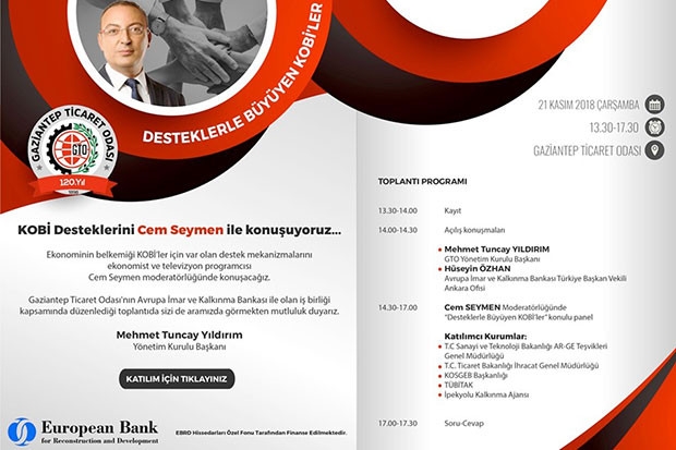Gaziantep Ticaret Odası (GTO) tarafından bu konuda yapılan açıklamada; GTO Yönetim Kurulu Başkanı Tuncay Yıldırım ve EBRD Türkiye Başkan Vekili Hüseyin Özhan’ın yerelde ve küresel pazarda KOBİ’lere ilişkin konuşmalarının ardından ekonomist ve televizyon program yapımcısı Cem Seymen’in moderatörlüğünde “DESTEKLERLE BÜYÜYEN KOBİLER” paneli gerçekleştirilecek.