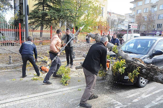 Şiddetli rüzgar nedeniyle kökünden sökülen ağaç yoldan geçen otomobilin üstüne devrilerek hasara yol açtı