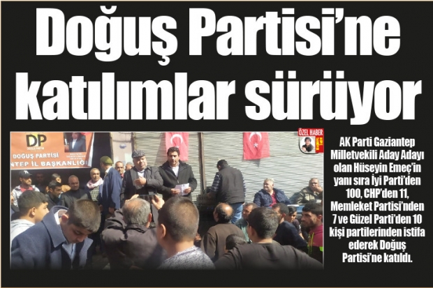 AK Parti Gaziantep Milletvekili Aday Adayı olan Hüseyin Emeç’in yanı sıra İyi Parti’den 100, CHP’den 11, Memleket Partisi’nden 7 ve Güzel Parti’den 10 kişi partilerinden istifa ederek Doğuş Partisi’ne katıldı.