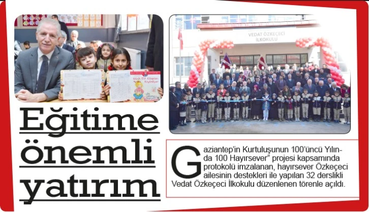 Vedat Özkeçeci İlkokulu’ nun açılış töreninde konuşan Vali Davut Gül; “‘Gaziantep’in Kurtuluşunun 100’üncü Yılında 100 Hayırsever’ projesini başlatırken biz Gaziantep’ e güveniyorduk. Projemize destek o kadar büyük oldu ki ‘Cumhuriyetin 100. Yılında 100 Hayırsever’ projesini de başlattık. Bu projemiz de büyük ilgi görüyor. Böylelikle Gaziantep’ e Cumhuriyet tarihinin en büyük eğitim yatırımını yapmış oluyoruz. Yaklaşık 80 yılda yapılan derslik sayısına 2 yıl için de ulaşmış olduk. Yapılan derslik sayılarının ve okulların fazlalığı velilerimizin öğrencileri ile ilgili sıkıntılarına da çözüm sağlamış olacak. İnşallah her öğrencimiz okul öncesi ile başlayıp çok iyi bir şekilde eğitim almış olacak.” sözlerine yer verdi.