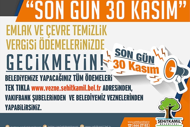 Şehitkamil Belediyesi; emlak, çevre temizlik, ilan ve reklam vergilerinin ikinci taksit ödemeleri konusunda vatandaşları uyardı. Ödemeler 30 Kasım 2017 mesai bitimine kadar nakit, kredi kartı, posta, banka ve online olarak yapılabilecek.