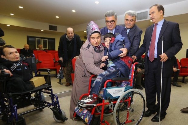 Gaziantep Büyükşehir Belediyesi Engelliler Daire Başkanlığı, engellilere tekerlekli sandalye, beyaz baston ve sesli saat dağıttı.