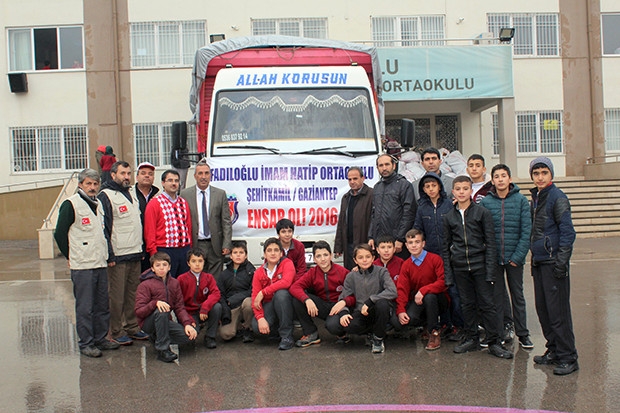 Şehitkamil İlçe Milli Eğitim Müdürlüğü’nün düzenlediği ve Fadıloğlu İmam Hatip Ortaokulunun Öncülük ettiği “ENSAR OL” Kampanyası dahilinde toplanan 3 tır dolusu İnsani yardım malzemesi Cansuyu Derneği ve Kızılay aracılığıyla Gaziantep’ten, Suriye’nin Halep kentine doğru yola çıktı.