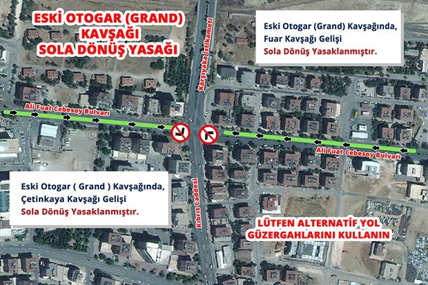 Bahse konu kavşakta araçların bekleme süresini azaltarak kent merkezindeki trafiği rahatlatmak amacıyla; Ali Fuat Cebesoy Bulvarı üzeri Çetinkaya ile Fuar kavşağından gelip sola Yeşilova Kavşağı istikameti ve sola Kıbrıs Caddesi (Nail Bilen ile Kamil Ocak Caddesi) istikametine sola dönüş yapılamayacak.