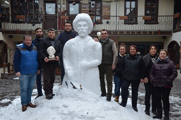 Eskişehir’de yağan karı fırsat bilen Lületaşı ustası, yeteneğini karda konuşturarak Yunus Emre heykeli yaptı.