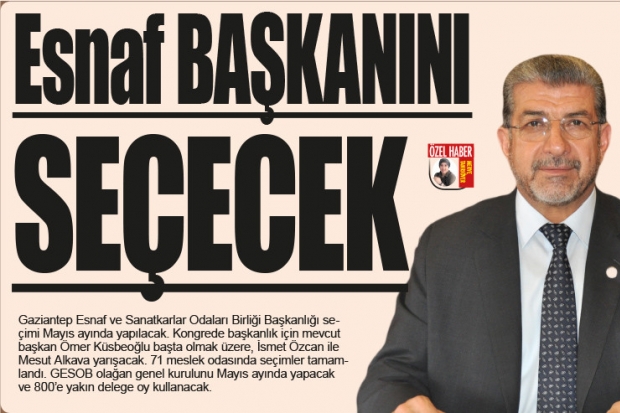 Gaziantep Esnaf ve Sanatkarlar Odaları Birliği Başkanlığı seçimi Mayıs ayında yapılacak. Kongrede başkanlık için mevcut başkan Ömer Küsbeoğlu başta olmak üzere, İsmet Özcan ile Mesut Alkava yarışacak. 71 meslek odasında seçimler tamamlandı. GESOB olağan genel kurulunu Mayıs ayında yapacak ve 800'e yakın delege oy kullanacak.