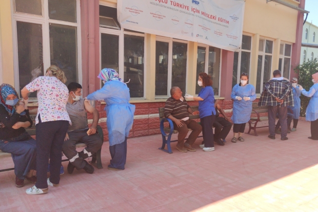 Türkiye genelinde devam eden aşılama çalışmaları kapsamında Gaziantep'te esnaf ve sanayi çalışanları yerinde aşılanıyor.