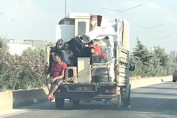 Organize Sanayi Bölgesi’ndeki Kamil Şerbetçi Bulvarı’nda seyreden kamyonetteki ailenin tehlikeli yolculuğu görüntülendi. Ev eşyalarının bulunduğu kamyonette yolculuk yapan aile, tehlikeye aldırış etmedi. Ev eşyalarıyla dolu kamyonet kasasının köşesinde yolculuk yapan aile, kameraları görünce yüzlerini kapatmaya çalıştı. Eşyalarla birlikte yolculuk eden 2’si çocuk 5 kişinin seyahati yürekleri ağza getirdi. Kamyonetin sürücüsü de şaşkın bakışlara aldırış etmeden ilerledi. Kamyonet seyir halindeyken bir kişi de kasanın kenarına oturup ayaklarını salladı.