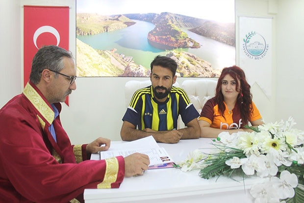 Gaziantep’in Yavuzeli ilçesinde İsmail Tekbaş ile Nigar Tekbaş düzenlenen törenle hayatlarını birleştirdi. Genç çift, nikah törenlerine gelinlik ve damatlık yerine gönül vermiş oldukları Galatasaray ve Fenerbahçe formasıyla katıldı. Ezeli rakiplerin formaları ile nikahı kıyılan fanatik çiftin şahitleri ise Beşiktaş ve Gaziantepspor forması giydi.