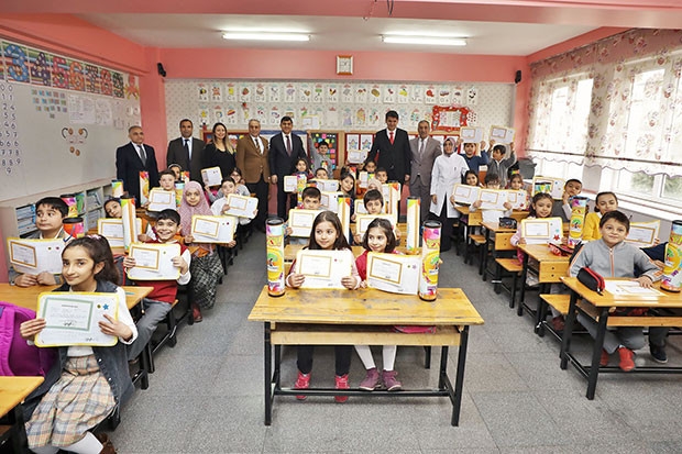 Kaymakam Ömer Kalaylı ile Başkan Rıdvan Fadıloğlu, öğrencilere karne hediyesi olarak satranç takımı ve çeşitli hediyeler verdi. Karne ve hediyelerini alan öğrencilerin mutluluğu gözlerinden okundu. Kaymakam Kalaylı ile Başkan Fadıloğlu, tüm öğrencilere yarıyıl tatili döneminde bol bol kitap okumalarını tavsiye ettiler.