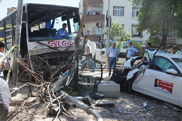 GAZİANTEP'te freni boşalan servis midibüsü, kırmızı ışıkta bekleyen otomobil ile motosikleti altına alıp metrelerce sürükledikten sonra direğe çarparak durdu. Kazada 4 kişi yaralandı.