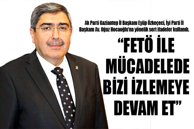 Ak Gaziantep İl Başkanı Eyüp Özkeçeci, son haftalarda üst üste açıklamalarıyla Ak Partili Şahinbey Belediye Başkanı Mehmet Tahmazoğlu ile il teşkilat yönetimini eleştiren İyi Parti Gaziantep İl Başkanı Av. Oğuz Hocaoğlu’nu sert bir dille eleştirdi. Özkeçeci, “Çamur at izi kalsın” mantalitesinin bir ürünü olan bu açıklamalarından dolayı Kocaoğlu’nu defaatle kınıyor, FETÖ ile destansı bir mücadele içinde olan partimize ve partimiz temsilcilerine vurmaya çalışan bu zata “Kişi kendinden bilir işi” düsturunu hatırlatır, FETÖ ile mücadelede bizi izlemeye devam etmesini tavsiye ederiz” dedi.