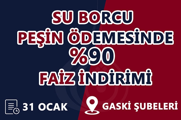 Kuruma borcu olan vatandaşların rahat ödeme yapabilmesi için harekete geçen GASKİ, bu kapsamda birikmiş su ve atık su borçlarının 6-9-12 veya 18 taksit olarak yapılandırılacağı, peşin ödeme ile yapılandıranlardan gecikme faizinin yüzde 90 indirileceği uygulamanın son başvuru tarihi 31 Ocak’a kadar uzatıldı. İşlemler GASKİ Merkez Binası, GASKİ Karataş Binası ve ilçelerde bulunan GASKİ Şubeleri’nden yapılıyor. Yapılandırmadan son ödeme tarihi 31 Ağustos 2020 ve öncesi olan faturalar yararlanacak.