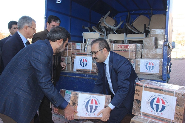 Gaziantep Üniversitesi (GAÜN) Atatürk kültür Merkezi önünde Rektör Prof. Dr. Ali Gür’ün de katıldığı programla yardım malzemeleri kamyonetlere yüklendi. İçerisinde okul sıra ve masalarının yanı sıra, eğitim setlerinin yer aldığı koliler, 2 ayrı kamyonete yerleştirildi.