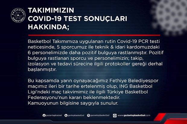 Gaziantep Basketbol takımında 5 sporcu ve 6 personelin korona virüs testinin pozitif çıktığı açıklandı. Bu hafta oynanacak olan Fethiye Belediyespor maçı ertelendi.