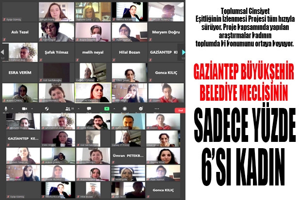 Türkiye’de Katılımcı Demokrasinin Güçlendirilmesi: Toplumsal Cinsiyet Eşitliğinin İzlenmesi Projesi, Gaziantep’te video konferans yöntemiyle devam ediyor. Proje yerel Koordinatörü Fatma Esin Özgül, Gaziantep deki CEİD izler Platformunun ilk online toplantısının gerçekleştirildiğini dile getirdi. Proje kapsamında yapılan araştırmada Gaziantep’te yerel meclislerinin Gaziantep Büyükşehir Belediye Meclisi üyelerinin 47’si erkek, 6’sı kadın olduğu ortaya çıktı. Yapılan açıklamada, “Kadınların meclisteki temsili, Türkiye ortalaması olan % 11 düzeyindedir. Gaziantep Büyükşehir Belediye Başkanı kadın iken, sınırlarındaki 9 ilçenin belediye başkanlarının tamamı erkektir. Yalnızca Gaziantep Büyükşehir Belediyesi’nde Eşitlik Birimi bulunmaktadır” denildi.