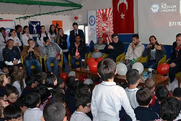 Futbolcuları büyük bir coşkuyla karşılayıp 3'lü çeken öğrenciler, hazırladıkları soruları İngilizce ve Türkçe olarak yönelttiler. Kaptan Burak, öğrencilerden Gaziantep Büyükşehir Belediyespor maçını izleme sözü aldı. Soruları yanıtlayan Vukovic Hajduk ise Split'i tuttuğunu belirtirken Türk futbolculardan Burak Yılmaz'ı beğendiğini söyledi. N'Dongala bu soruya Barcelona ve Arda Turan yanıtını verdi.