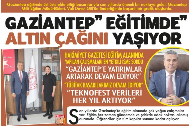 Son yıllarda Gaziantep’te eğitim alanında çok yoğun çalışmalar var. Eğitim her zaman gündemde ve şehirde odak noktası alınmış durumda. Öğrenciler için tüm kapılar sonuna kadar açılıyor. Çalışmalar, “Gaziantep Modeli” adı verilen ve hizmet sağlamada kurumsal iş birliğinin ön plana çıkarıldığı model ile yapılıyor. Gaziantep İl Milli Eğitim Müdürü Yasin Tepe, eğitimin tüm alanlarında kentin önemli bir noktaya geldiğini ifade etti. Hakimiyet Gazetesi Yazı İşleri Müdürü Sabiha Kocaman'la Gaziantep'in eğitimini masaya yatıran Tepe, tüm alanlarda çalışmaların başarılı bir şekilde sürdürüldüğüne dikkat çekti.