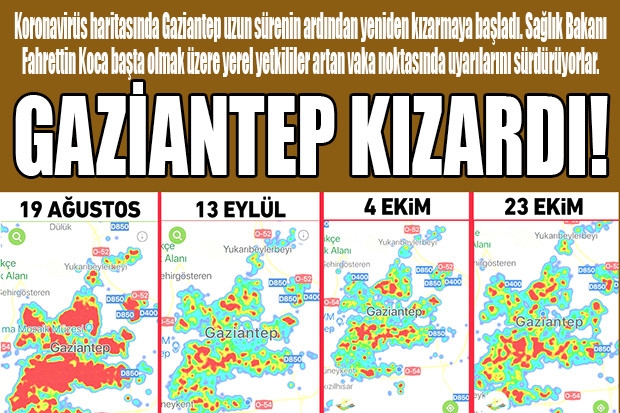 19 Ağustos Gaziantep koronavirüs haritasına göre kentimizde vaka sayıları oldukça yüksek görünse de bu tablo 13 Eylül'de olumlu yönde değişti. 13 Eylül ve 4 Ekim haritaları Gaziantep'te vakaların azaldığını gösteriyor; fakat bugün yani 23 Ekim haritası kentimizde vakaların yeniden yükselişe geçtiğini gözler önüne seriyor.
