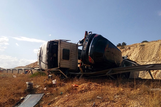 Edinilen bilgiye göre, Gaziantep-Şanlıurfa otobanında seyir eden Özgür K. idaresindeki 41 B 2830 plakalı tır, yolun 15. kilometresinde emniyet şeridinde park halinde bulunan Hüseyin Y idaresindeki otomobile arkadan çarptı. Çarpmanın etkisiyle tır karayoluna devrilirken, üzerinde bulunan otomobiller ise yola saçıldı. Meydana gelen kaza nedeniyle otobanda araç mezarlarını andıran görüntüler ortaya çıktı.