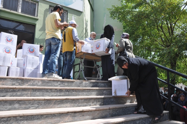 Ülkelerindeki iç savaştan kaçarak kente sığınan Suriyeli mülteciler için İyilik Derneği ve Uluslararası Yardımlaşma Derneği bin gıda paketi dağıttı. Sabah saatlerinde Mütercim Asım Sosyal Tesisleri önüne gelen Suriyeli sığınmacılar, gıda paketinden alabilmek için kayıt sırasına girdi. Sosyal tesis önündeki masalarda kimlik kontrolleri ile kayıtları yapılan Suriyeliler, dağıtımın yapıldığı alanda uzun kuyruk oluşturdu. İçerisinde şeker, pirinç, yağ, makarna gibi temel gıda maddelerinin Gıda paketini alan Suriyeliler, kucakladıkları koliyle evlerinin yolunu tuttu.