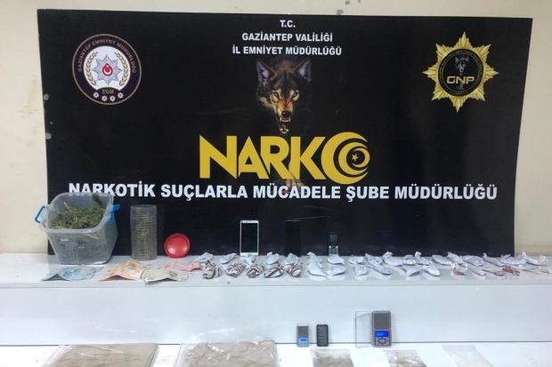 Gaziantep Emniyet Müdürlüğü Narkotik Suçlarla Mücadele Şubesi ekipleri, yürüttükleri başarılı çalışmalar sonucunda Akdere, Boyacı, Yazıcık ve Şirinevler mahallelerinde bulunan 4 ikamete operasyon düzenledi. Ekipler operasyonlarda, 1 Kilo 556 gram eroin, 380 gram esrar, 43 gram metamfetamin, 2 adet hassas terazi ele geçirdi.