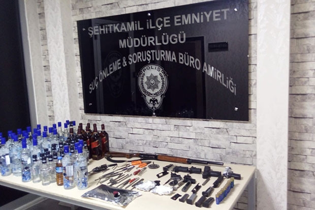 Ekipler yapılan operasyonla kaçak olduğu anlaşılan 23 adet rakı, 28 adet votka, 10 adet viski, 1 adet kurusıkıdan çevirme tabanca, 4 adet tabancaya ait silah mekanizması, silah namlusu ve silah sürgüsü, 6 adet şarjör, silah üretiminde kullanılan çok sayıda matkap ucu, pense, 1 adet av tüfeği ile 1 adet kumar makinesi ele geçirdi. Şüpheli şahıslar M.K. ile A.D. ise yakalanarak gözaltına alındı.