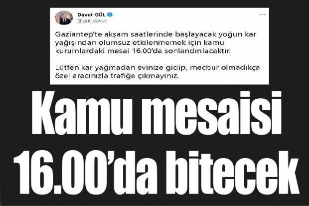 Akşam saatlerine doğru yoğun kar yağışı beklendiğini açıklayan Gaziantep Valisi Davut Gül, "Gaziantep’te akşam saatlerinde başlayacak yoğun kar yağışından olumsuz etkilenmemek için kamu kurumlardaki mesai 16.00’da sonlandırılacaktır. Lütfen kar yağmadan evinize gidip, mecbur olmadıkça özel aracınızla trafiğe çıkmayınız" ifadelerini kullandı.