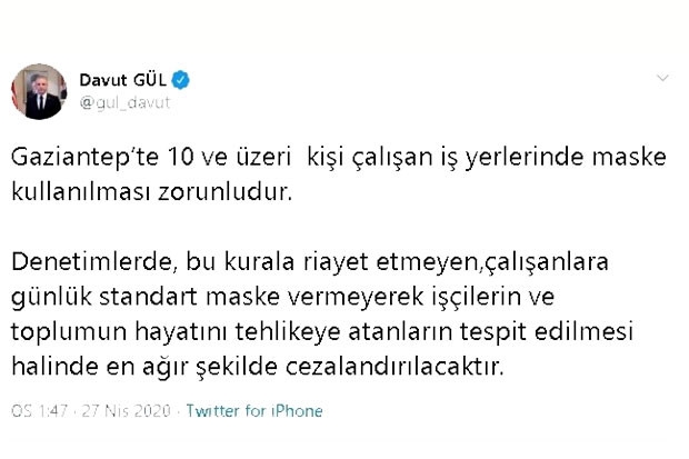 Vali Gül Sosyal medya hesabından yaptığı açıklamada yasağa riayet etmeyenlerin cazalandırılacağını belirterek, "Gaziantep’te 10 ve üzeri kişi çalışan iş yerlerinde maske kullanılması zorunludur. Denetimlerde, bu kurala riayet etmeyen,çalışanlara günlük standart maske vermeyerek işçilerin ve toplumun hayatını tehlikeye atanların tespit edilmesi halinde en ağır şekilde cezalandırılacaktır" ifadelerine yer verdi.