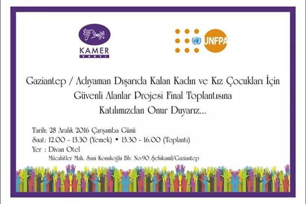 KAMER Vakfı ve Birleşmiş Milletler Nüfus Fonu (UNFPA) iş birliği ile Gaziantep-Adıyaman Dışarıda Kalan Kadın ve Kız Çocukları İçin Güvenli Alanlar Projesi Final toplantısı Gaziantep’te gerçekleştirilecek. Çok sayıda resmi kurum, Kamer Vakfı ve Birleşmiş Milletler Temsilcilerinin katılacağı toplantıda Gaziantep-Adıyaman Dışarıda Kalan Kadın ve Kız Çocukları İçin Güvenli Alanlar Projesi ile ilgili faaliyetler anlatılacak.