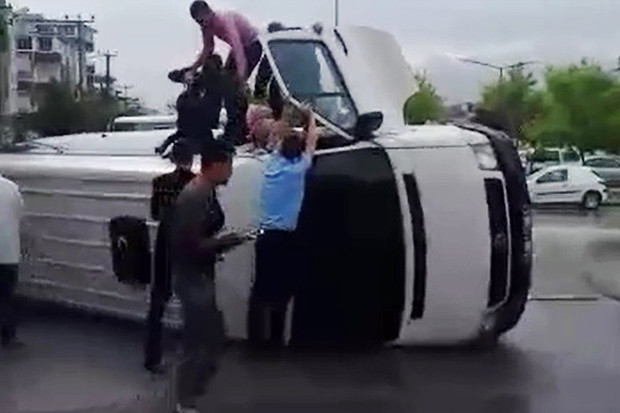 Gaziantep'te devrilen bir işçi servisindeki yaralılar ve şoka girenler, yara almadan kurtulan işçilerin yardımıyla araçtan çıkarıldı.