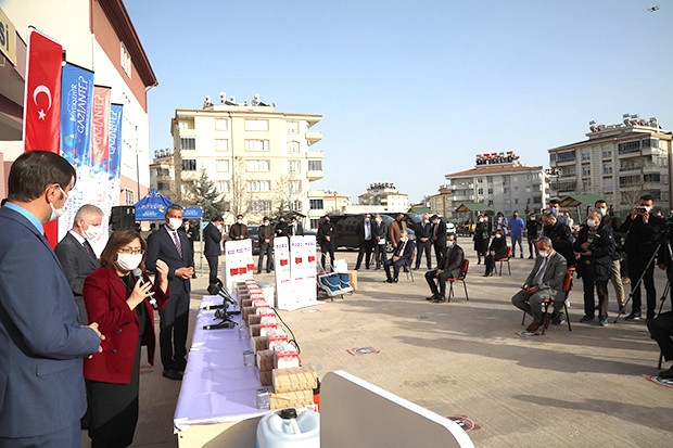 Dünya’yı ve Türkiye’yi kısa sürede etkisi altına alan yeni tip Koronavirüs (Kovid-19) Salgını çerçevesinde birlikte iş yapma modeli olarak görülen Gaziantep Modeli ile il sınırları içerisinde bulunan bütün okullar için Gaziantep Büyükşehir Belediyesi, Gaziantep Valiliği koordinatörlüğünde Gaziantep İl Milli Eğitim Müdürlüğü’yle ortaklaşa hareket ederek 1 Mart’tan itibaren kademeli olarak açılacak okulların maske, temizlik malzemesi ve tedbirlerin içinde bulunduğu ihtiyaçlarını “Okullarımızı güvenle açıyoruz” sloganıyla tamamlandı. Okullarda Koronavirüs bulaş riskinin azaltılmasının hedeflendiği çalışmada Büyükşehir Belediyesi, 6 milyon TL’lik bütçe ayırarak okulların bu konuda bütün ihtiyaçlarını giderdi. Şehitkamil İlçesi Vedat Topçuoğlu’nda düzenlenen tanıtım toplantısında Büyükşehir Belediyesi tarafından şehirde bulunan bin 157 okulun temizlenerek 10 bin litre yüzey dezenfektanı, 75 bin litre sıvı el sabunu, 410 bin yıkanabilir maske, 2 bin adet el dezenfektan standı, 50 bin adet yer stickerı, 500 adet klozetör akülü dezenfektan sıkma makinesinden oluşan malzemeleri temin etti. Malzemeler okulların bir yıllık temizlik ihtiyaçlarını karşılayacak şekilde ayarlandı. Tanıtıma Gaziantep Valisi Davut Gül, Gaziantep Büyükşehir Belediye Başkanı Fatma Şahin, Gaziantep İl Milli Eğitim Müdürü Yasin Tepe ve okul müdürleri katıldı.