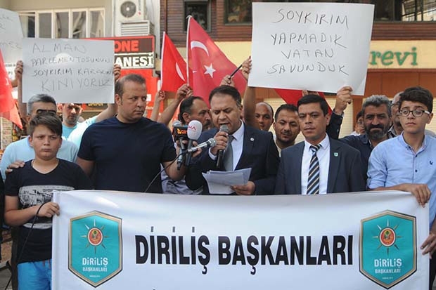 Balıklı Parkı'nda öğle saatlerinde yapılan protestoya yaklaşık 30 kişilik grup katıldı. 'Soykırım yapmadık, vatanı savunduk', 'Alman parlamentosunun soykırım kararını kınıyoruz' dövizleri taşıyan grup Mehter Marşı çalarak ellerindeki Türk Bayraklarını salladı. Grup adına konuşan İl Başkanı Şevket Kirişanlı, Türkiye ile Almanya'nın tarihte hep dost olduğunu ancak Almanya'nın almış olduğu bu kararla dostluğa ihanet ettiğini söyledi.