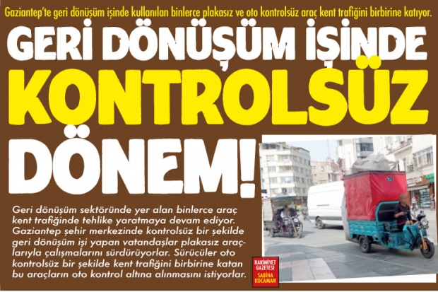 Geri dönüşüm sektöründe yer alan binlerce araç kent trafiğinde tehlike yaratmaya devam ediyor. Gaziantep şehir merkezinde kontrolsüz bir şekilde geri dönüşüm işi yapan vatandaşlar plakasız araçlarıyla çalışmalarını sürdürüyorlar. Sürücüler oto kontrolsüz bir şekilde kent trafiğini birbirine katan bu araçların oto kontrol altına alınmasını istiyorlar.