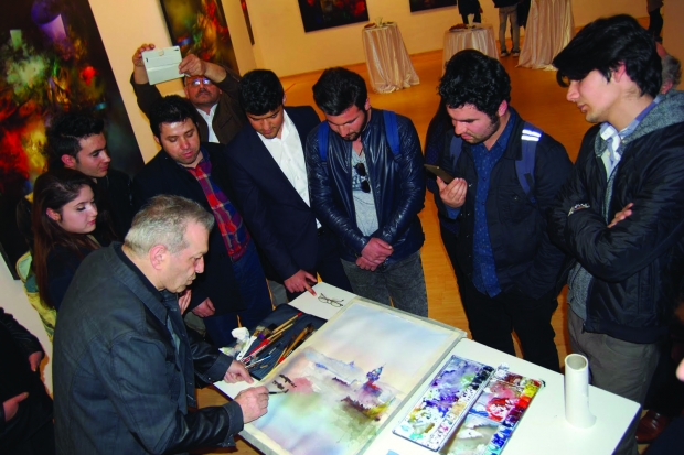 Sergi açılışına gelenlere suluboya canlı performans yapan ve İstanbul Kız Kulesi’ni resmeden Günel, “Güzel bir resim yapmak için kâğıdın, fırçanın ve boyanın kaliteli olması gerekir. Kullandığım fırçalar Almanya’da adıma üretiliyor. Sulu boya resim en zor yapılan resimlerdendir. Tuvaldeki gibi oynama şansınız yok” dedi.