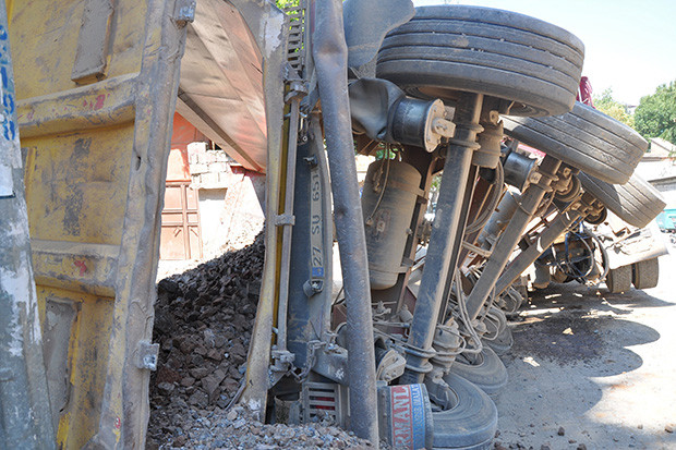 Edinilen bilgiye göre, saat 12.00 sıralarında İslahiye Derviş Paşa İlköğretim Okulu önüne hafriyat taşıyan Bayram G. idaresindeki 27 SV 698 plakalı kamyon, dar sokakta hafriyatın boşaltıldığı esnada yan yattı. İslahiye Belediyesine ait olan kamyonun alt yapı çalışmaları için hafriyat taşıdığı öğrenilirken, sürücü Bayram G. kazadan yara almadan kurtuldu. Kamyonun damperindeki hafriyatların etrafa saçıldığı kazanın ise yükün dengesiz yüklenmesi nedeniyle meydana geldiği tahmin ediliyor.
