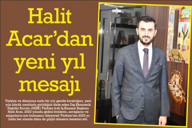 Dış Ekonomik İlişkiler Kurulu (DEİK) Türkiye Irak İş Konseyi Başkanı Halit Acar yayımladığı yeni yıl mesajında zorlu bir yılın geride kaldığını büyük umutlar ve beklentilerle 2023 yılına girileceğini ifade ederek 2023 yılının dünya için barış ve huzur yılı olmasını diledi. Acar mesajında “Son yıllarını büyük sorunlar yaşayarak geçiren dünyamızın başta sağlık alanında olmak üzere, bütün alanlarda normale dönerek insanların huzur ve barış içerisinde yaşayabileceği yeni bir yıl olmasını diliyorum. Elbette 2023 yılı bir çok konuda insanlık için umutlar ve büyük beklentilerle dolu bir yıl olarak geliyor. Bizlerde bu yılda daha fazla çalışmak, daha fazla üretmek, yenilikçi ürünlere yönelerek yüksek katma değerli ürünlerimizi dünya pazarlarına sunmak ve ihracatımızı arttırarak ülke ekonomisine büyük katkılar sağlamak zorundayız. 2023 yılı değişim ve dönüşümün daha hızlı yaşanacağı bir yıl olarak önemli sinyaller veriyor. Bu anlamda ülke olarak dijital dönüşümümüzü hızlandırmak ve bütün sektörlerimizi yeni yüzyılın gerektirdiği oluşumlara hazırlamak zorundayız. 2023 yılının ülkemiz ve milletimiz başta olmak üzere bütün dünyaya ve insanlığa sağlık, huzur ve mutluluklar getirmesini diliyor, yeni yılınızı kutluyorum” dedi.