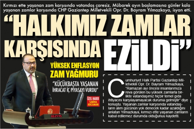 Cumhuriyet Halk Partisi Gaziantep Milletvekili Opr. Dr. Bayram Yılmazkaya, "Ramazan ayı öncesi insanlarımıza reva görülen bu yüksek zamlarla birlikte vatandaşımız hiçbir temel gıda ihtiyacını karşılayamayacak duruma gelmiştir" diye konuştu. Yaşanan zamlar karşısında vatandaşların alım gücünün yok denecek kadar azaldığını anlatan Yılmazkaya, kırmızı ette yaşanan zamların kabul edilemez durumda olduğunuu kaydetti.