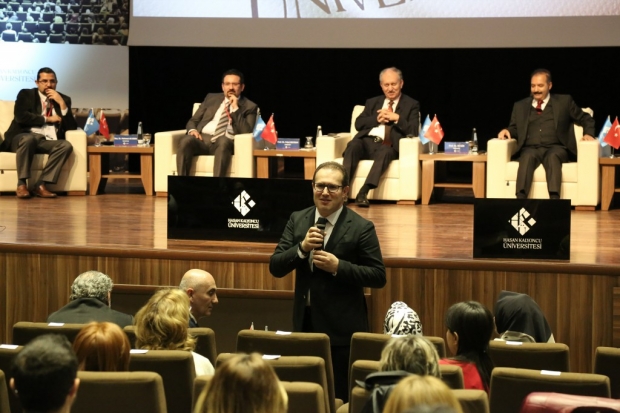 Açılış konuşmalarının ardından HKÜ Mütevelli Heyeti Başkan Vekili Haluk Kalyoncu, Sağlık Bakanlığı Müsteşar Yardımcısı Dr. Şuayip Birinci’ye hediye takdim etti.