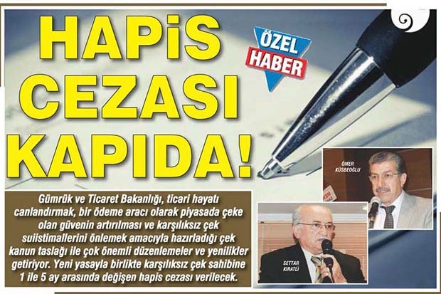 Gümrük ve Ticaret Bakanlığı, ticari hayatı canlandırmak, bir ödeme aracı olarak piyasada çeke olan güvenin artırılması ve karşılıksız çeksuiistimallerini önlemek amacıyla hazırladığı çek kanun taslağı ile çok önemli düzenlemeler ve yenilikler getiriyor. Yeni yasayla birlikte karşılıksız çek sahibine 1 ile 5 ay arasında değişen hapis cezası verilecek.