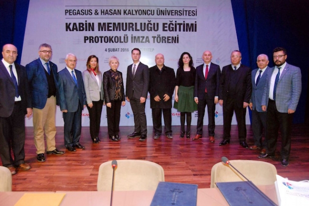 Yapılan protokolle sivil havacılığa kalifiye eleman yetiştireceklerini söyleyen Hasan Kalyoncu Üniversitesi Rektörü Tamer Yılmaz ise "Bir yıldır sürdüğümüz bu projenin sonuna yaklaşıyoruz. Aslında bir başlangıç bu eğitime başlayacağız. Sivil havacılık genel müdürlüğünden bir yetki aldık bu yetkiyle artık Hasan Kalyoncu Üniversitesi tüm uçaklarda hizmet verecek kabin memurlarına eğitmek üzere tam yetkili kuruluş kurum olmuştur. Ve bu yetkiyi de alan başka bir kurum yoktur. Bu nedenle bu yetkinin alınmasında emeği geçen öncelikle Pegasus Havayolları'na teşekkür ediyorum. Çok ciddi bir destek gösterdiler ve bizim hasan kalyoncu üniversitesine personeline teşekkürlerimi ve şükranlarımı sunuyorum. Hem üniversitem adına hem de sivil havacılık adına. Sivil havacılık Türkiye’nin lider sektörlerinden çok hızlı gelişen sektörlerinden biri. Belki bunun gibi birkaç sektör var bu ilk 3 içerisinde gıda sektörü de buna benzer sektör o da çok hızlı gidiyor. Ama sivil havacılık ondan çok daha ivmeli çok hızlı gelişen bir sektör. Tabi sektör eğitimin önünde olmaya başlayınca eğitim bazen sektöre ara personel yetiştirmekte nitelikli personel yetiştirmekte geri kalabiliyor. Dolayısıyla HKÜ ve Pegasus Havayolları açığı gördü. Sektörün ihtiyacı olan çok önemli ihtiyacı olan kabin memurluğunu yetiştirmek üzere hazırlıklarını tamamladı. Ciddi bir alt yapı oluşturduk. Eğitim müfredat oluşturduk. Eğitmenlerimizi hazırladık. Kitapçığımız var. Çok önemli bir eğitim materyali oluştu. Bu literatüründe önemli katkı hazırlığımızı yaptık. Bugünden itibaren protokolde imzalayacağız. Artık kayıtlarımıza başlayacağız.2016 yılında yaklaşık 500 kabin memuru eğitmek ile ilgili bir hedefimiz var. Ama ilk etapta bunu beşer kişilik gruplarla belki 3 grup yada 4 grup ’la başlayacağız. Pegasus havayollarının ihtiyacı doğrultusunda birlikte yola çıkararak birlikte karar verdik. Bir takım sivil havacılığın genel kuralları var onlarda önemli gerçekten havada hizmet vermek havacılık yapmak. Hem uçaklarda hem de personellerde ciddi nitelikli belgelenmiş yetkilendirilmiş kurallara tabi bu nedenle bunlara uyarak devam etmeye çalışacağız" diye konuştu.