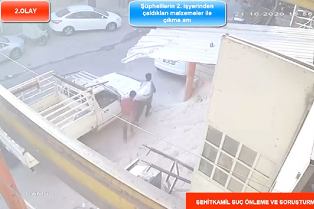 Gaziantep Emniyet Müdürlüğü'ne bağlı Şehitkamil İlçe Emniyet Müdürlüğü ekiplerince Sanayi Mahallesi'nde meydana gelen hırsızlık olayı ile ilgili yakalanan şüpheli şahsın hırsızlık anlarına ait güvenlik kamerası görüntüleri ortaya çıktı. Görüntülerde, şahısların iş yerleri önünde önce etrafı gözetledikleri, sonrasında ise içeri girerek torbalar dolusu malzemelerle dışarı çıkma ve kaçma anları yer aldı.