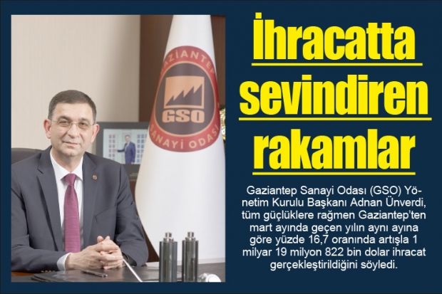 Gaziantep Sanayi Odası (GSO) Yönetim Kurulu Başkanı Adnan Ünverdi, tüm güçlüklere rağmen Gaziantep’ten mart ayında geçen yılın aynı ayına göre yüzde 16,7 oranında artışla 1 milyar 19 milyon 822 bin dolar ihracat gerçekleştirildiğini söyledi.