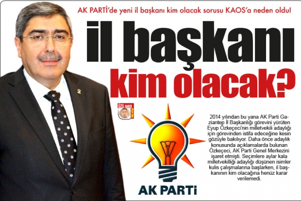2014 yılından bu yana AK Parti Gaziantep İl Başkanlığı görevini yürüten Eyup Özkeçeci’nin milletvekili adaylığı için görevinden istifa edeceğine kesin gözüyle bakılıyor. Daha önce adaylık konusunda açıklamalarda bulunan Özkeçeci, AK Parti Genel Merkezini işaret etmişti. Seçimlere aylar kala milletvekilliği adaylığı düşünen isimler kulis çalışmalarına başlarken, il başkanının kim olacağına henüz karar verilemedi.