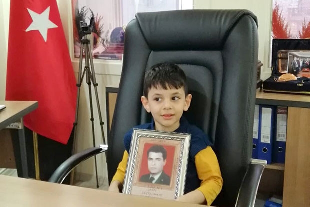 Gaziantep'te Türkiye Harp Malulü Gaziler, Şehit Dul ve Yetimleri Dernek Başkanı'nın makam koltuğuna oturan şehit torununun ilk isteği dedesini görmek oldu. Şehit torununa dedesinin resmi verildi.