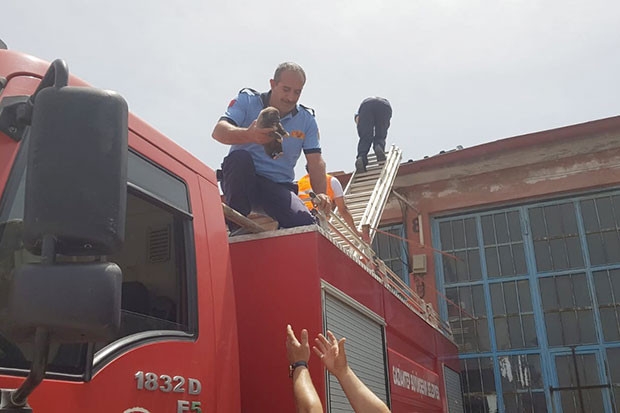 Gaziantep'te kapalı bir iş yerinin çatısında mahsur kalan yavru köpek, itfaiye ekiplerinin çalışması sonucu kurtarıldı.