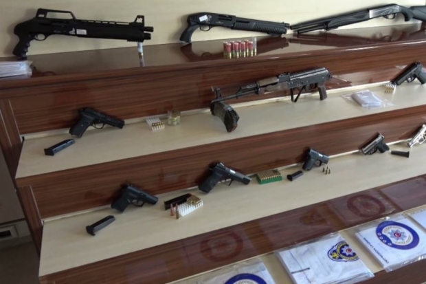 Şüphelilerin adreslerinde yapılan aramalarda ise 1 kaleşnikof tüfek, 9 dolu, 30 boş kaleşnikof mermi, 1 G-3 piyade tüfeği, 5 tabanca, 84 tabanca mermisi, 4 av tüfeği, 27 av tüfeği fişeği, 9 ses fişeği, 6 kurusıkı tabanca, 1 sustalı bıçak, 10 uyuşturucu hap, 60 gram esrar, 100 gram skunk, 78'i boş 99 senet, 2 şirket kaşesi, 2 çek, 4 çek defteri, 4 vekaletname, 2 tapu, 1 ihtarname ve çok sayıda hayali şirket evrakı ile dekontlar ve çek fotokopileri ele geçildi.