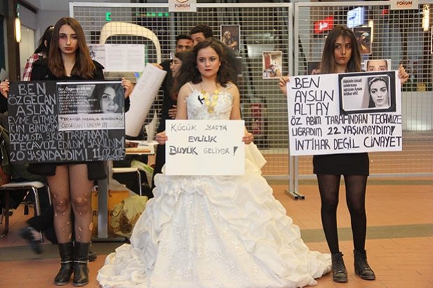 Gaziantep Üniversitesi Toplum Gönülleri Grubu öğrencileri ve Gaziantep’in çeşitli üniversitelerinde bulunan öğrenciler, 8 Mart Dünya Kadınlar Günü için Forum Gaziantep AVM’de etkinlik düzenledi. Bir araya gelen öğrenciler, bir kız öğrenciye gelinlik giydirip, kız çocuklarının çocuk yaşta evlendirilmelerine tepki gösterdi. Diğer kız öğrenciler de yüzlerindeki makyaj ile yara ve morluklar yaparak, bayanların tacize uğrayıp, şiddet uygulanmasının durdurulmasını istedi. Bazı kız öğrenciler de Özgecan Aslan, Cansel Buse Kınalı ve Aysun Altay’ın kılığına girerek, onların adına sağduyu çağrısında bulundu. Erkek öğrenciler de ellerinde, “Kadına şiddete hayır”, “Hani onlar çiçekti” gibi yazılı pankartlarla bayan arkadaşlarına destek verdi. Mini tiyatro oyunlarının sergilendiği etkinlikte, bazı öğrenciler uygulanan şiddet ve tecavüzler gibi olayların ardından ayakta duramayan kadınlarını canlandırırken, kimi öğrenciler de gözyaşlarına hakim olamayarak arkadaşlarına sarıldı. Gaziantep Üniversitesi Hukuk Fakültesi 1. Sınıf Öğrencisi Merve Aktepe, kız çocuklarının erken yaşta evlendirilmesine tepki olarak, gelinlik giydiğini ifade ederek, 8 Mart Dünya Kadınlar Günü anısına böyle bir etkinlik düzenlediklerini ifade etti. Merve, “Çocuk gelinler ülkemizin sorunlarından, en önemli sıkıntılarından bir tanesidir. 14 13-14 yaşındaki kızlarımız okul çağındayken, kendilerinden kaç yaş büyük amcaları babaları ve dedeleri yaşlarında insanlarla evlendiriliyorlar. Buna tepki olsun diye gelinlik giymek istedim. Belki genç bir kızımızın veya bir çocuğumuzun, okul sıralarından mahrum kalmasını engelleyerek, kaderini değiştirebiliriz diye ümit ederek, burada bulunuyoruz” diye konuştu.