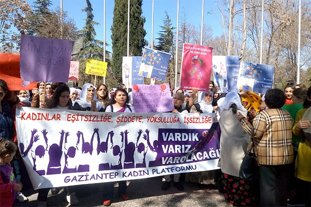 Kırkayak Parkı’nda düzenlenen basın açıklamasında Gaziantep Kadın Platformu üyeleri, “Biz kadınlar her 8 Mart’ta olduğu gibi bu 8 Mart’ta da taleplerimizi yinelemek, sesimizi yükseltmek için bir araya geleceğiz. Son zamanlarda giderek artan kadın cinayetlerine, tacize, tecavüze “Dur!” diyoruz. Çocuklara yönelik uygulanan şiddete, tacize ve çocuk yaşta evliliklere “Hayır!” diyoruz! En temel hakkımız olan, yaşam hakkımızı güvence altına almak için İstanbul Sözleşmesi’nin uygulanmasını talep ediyoruz. İktidar unsurlarının ve medyanın takip ettiği cinsiyetçi ve kadın düşmanı politikalar ve söylem, kadınlar için yaşamı daha zor hale getiriyor. Ekonomik krizin şiddetinin artmasıyla birlikte, krizin faturasının artan zamlar ve vergilerle halka kesilmesi, biz kadınların omuzlarında taşıdığı yükü de ağırlaştırıyor. Dolayısıyla uygulanan ekonomik politikalara itiraz ediyoruz. Gaziantep Demokratik Kadın Platformu olarak parasız eğitim, parasız sağlık, kreş ve nafaka hakkı gibi taleplerimizin yanı sıra, savaşa “hayır”” diyoruz” şeklinde konuştular.