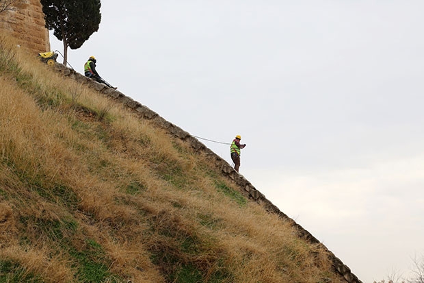 Gaziantep Kalesi'nde iki görevlinin kale duvarlarını temizleme çalışması, ilgiyle izlendi.